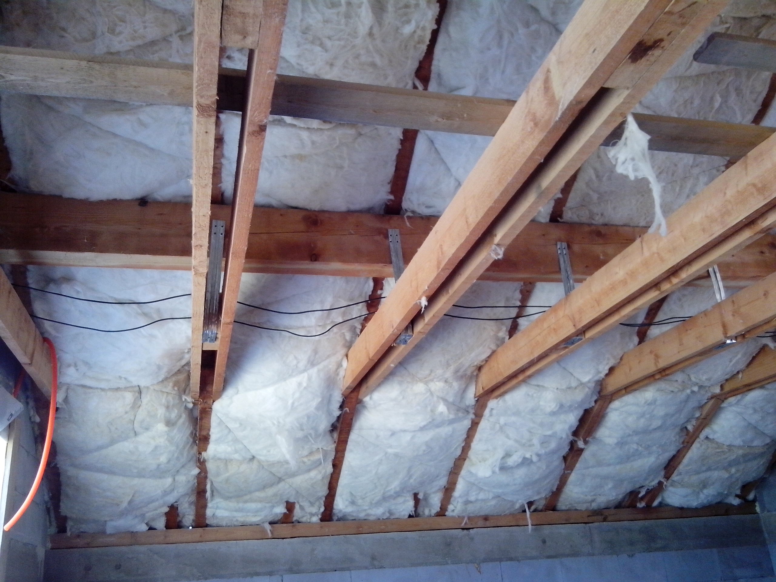 Izolace mezi krokve 20 cm je přichycená drátky. Přes krokve jsou latě 6x4 cm a mezi ně 6 cm izolace. Přes latě přisponkovaná parotěsná bublinková fólie z vnitřní strany hliníková a až potom konstrukce a sádrokarton.Tato fólie by měla izolovat jako 5 cm vaty. Až po ní se budou tahat kabely, proto nebude nikde poškozená a navíc díky mezeře mezi sádrokartonem výrobce uvádí, že hliníková strana odráží až 6 % tepla.