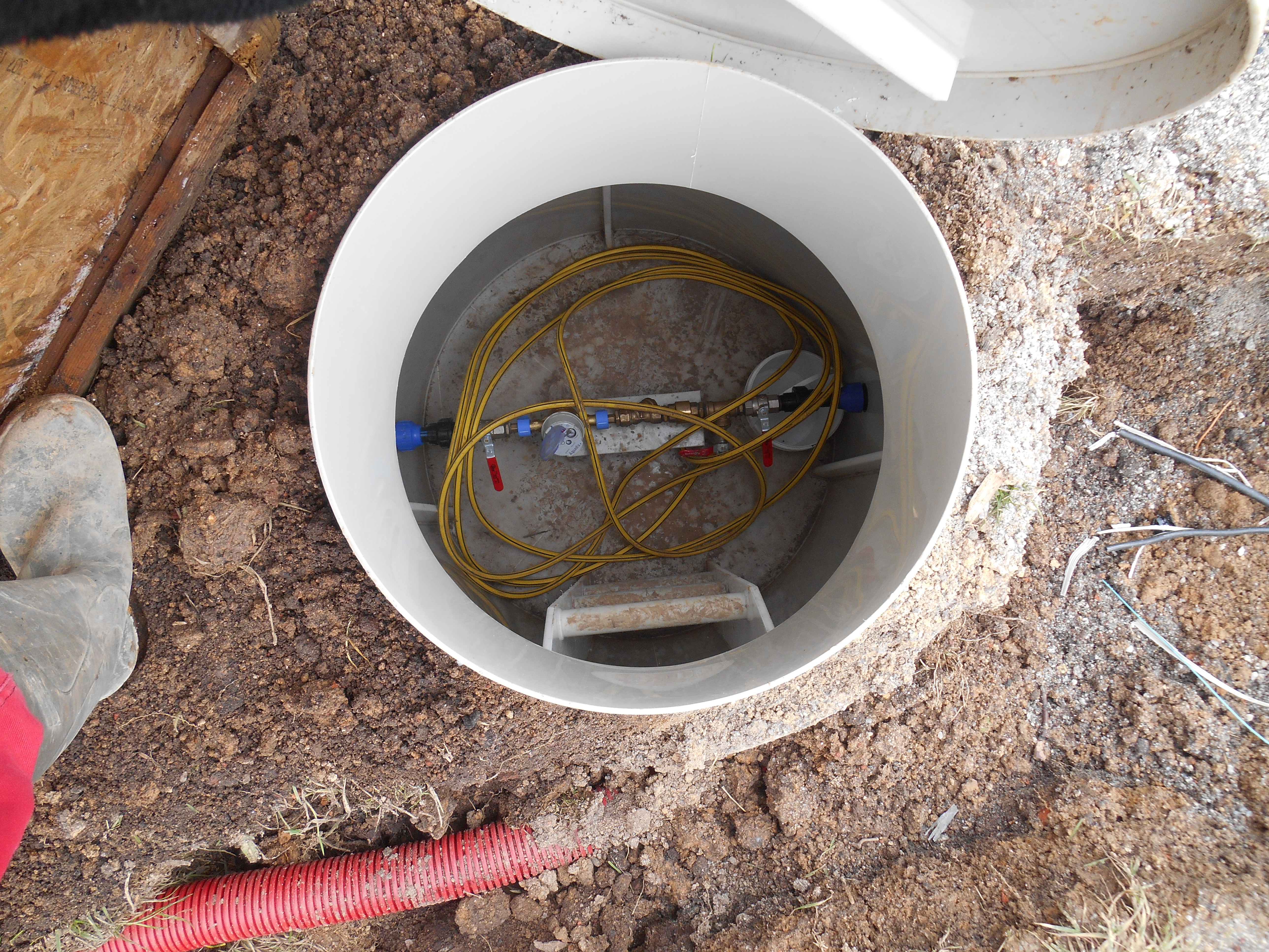 Na sloupu stáhli přívod do krabice a z ní pod silnicí do elektroměrového pilířku. Na vodoměr musela být vodoměrná šachta s hlavním uzávěrem.