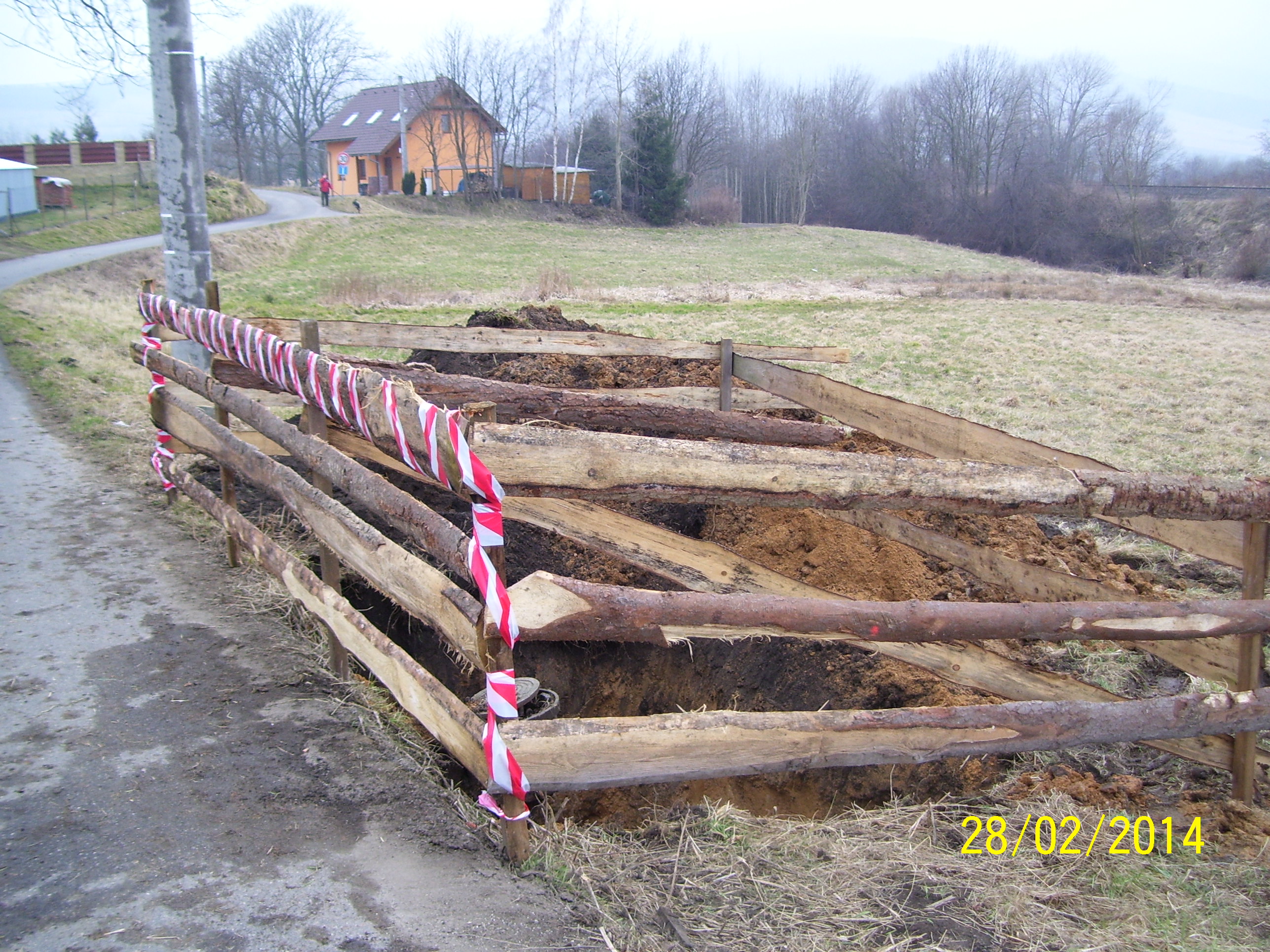 Bagr vykopal na obou stranách silnice jámy a protlakem pod silnici narazily 2 trubky na vodu a kabel.